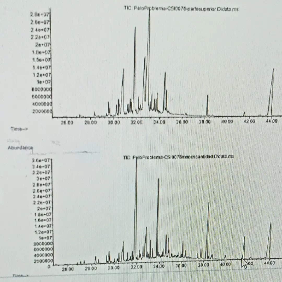 Cromatograma TIC obtenido en el análisis de ambas porciones de pelo de una muestra proporcionada por la solicitante.:Parte superior del cabello (próximo a la cabeza,compuestos